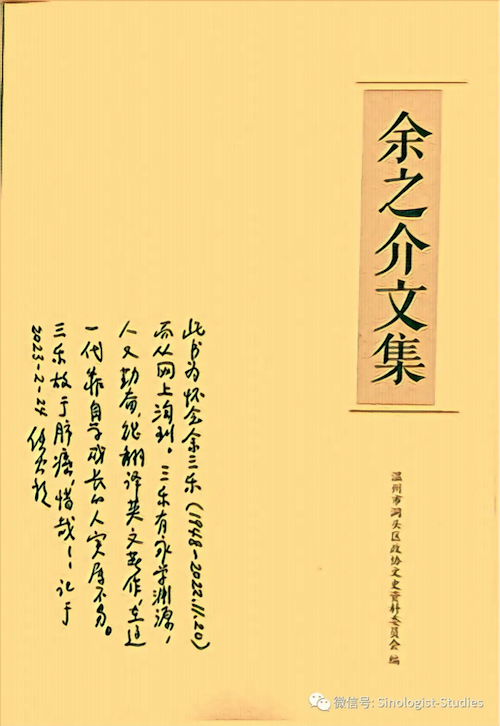 疫情期间,有的朋友去世,但也无法参加悼念,有的甚至没有消息。记得老友余三乐(1948-2022.11.20)病故,我大约今年2月才知道,我淘到一本三乐父亲的文集《余之介文集》,是温州地方上印的,读这本书,我更了解了三乐和他的家庭。三乐出身革命家庭兼书香门第,其父余之介,1907年生于温州北岙,1926年参加革命、1938年入党,当时与郭沫若等许多著名爱国民主人士友谊深笃,1947年4月余之介结婚时,郭沫若和黄炎培、沈钧儒、叶圣陶等专程赴贺。郭沫若以新人夫妇“均从事教育,志同道合,结为佳偶”有感,特书《桃李花秾》以祝,其中有云:“君植李,我植桃,桃李花秾春正好。坐春风,席春草,不愿门墙高,只愿蹊径少,春申江上乐淘淘。”