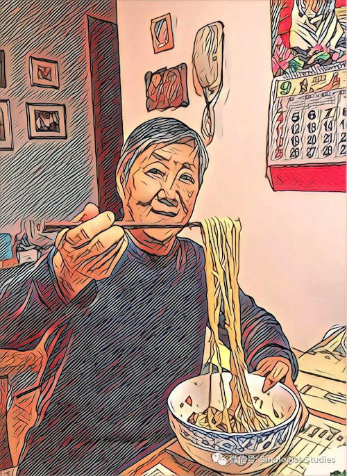 内子今年70大寿,我亲自为其做长寿面,用陕西“老碗”上桌,她的动作,北京人叫“挑寿”。 夏天我们到张家口避暑,景点大境门的街头画家高先生,给我们作了漫画。