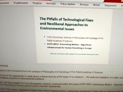 另一位是:波兰科学院哲学与社会学研究所(IFiS PAN)“AUTO-WELF” 项目博士后研究员 塞林娜・斯特泽莱茨卡(Celina Strzelecka),演讲主题:“技术解决方案与新自由主义路径在环境问题中的局限性分析”。